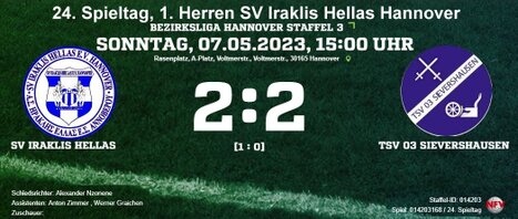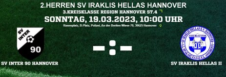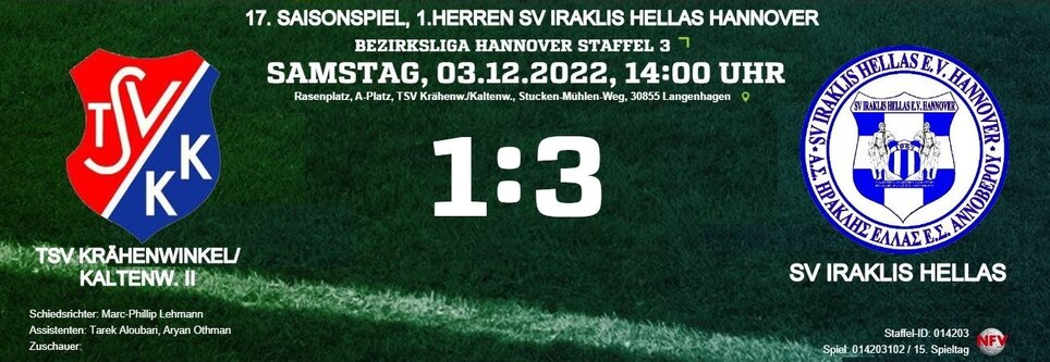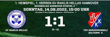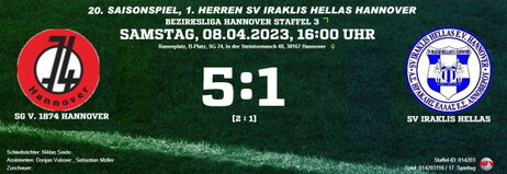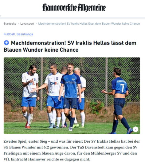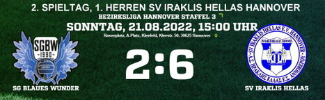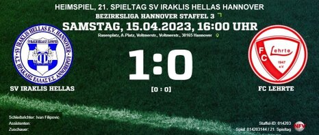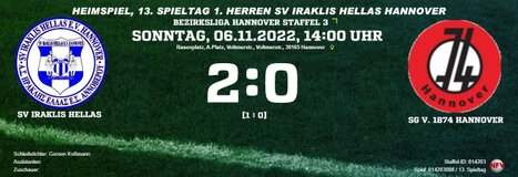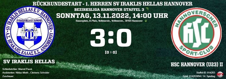 ![]() Bezirksliga Hannover Staffel 3: SV Iraklis Hellas – SG v. 1874 Hannover, 2:0 (1:0) NÄCHSTER ERFOLG FÜR SV IRAKLIS HELLAS | |||||