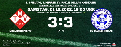 ![]() Bezirksliga Hannover Staffel 3: Mellendorfer TV – SV Iraklis Hellas, 3:3 (2:1), UNENTSCHIEDEN IN MELLENDORF: PARFENI VERHINDERT DIE NIEDERLAGE | |||||