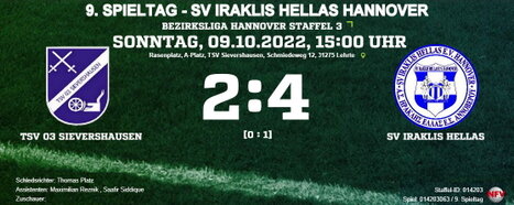 ![]() Bezirksliga Hannover Staffel 3: TSV 03 Sievershausen – SV Iraklis Hellas, 2:4 (0:1), in Lehrte SV IRAKLIS HELLAS SCHIESST SICH AN DIE SPITZE | |||||