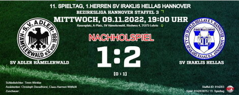 ![]() Bezirksliga Hannover Staffel 3: SV Adler Hämelerwald - SV Iraklis Hellas 1:2 (0:1) SIEG FÜR SV IRAKLIS HELLAS IN EINER TEILWEISE FEINDLICHE UND GASTUNFREUNDLICHE UMGEBUNG | |||||