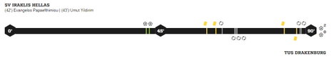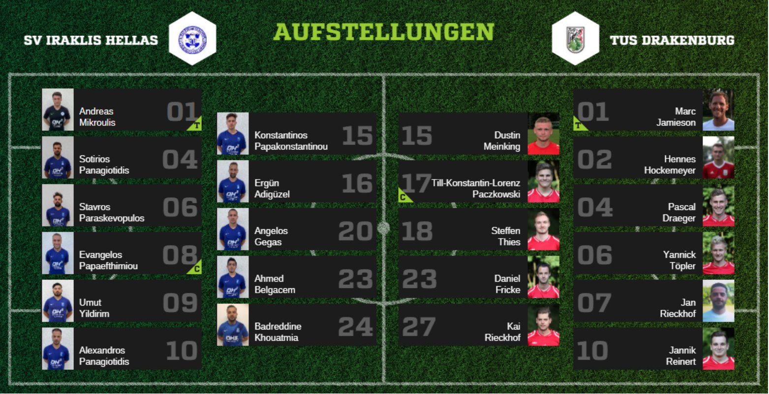 Während einige mit ihren Gedanken bereits in der Pause waren, nutzte Evangelos Papaefthimiou seine Chance und schoss das 1:0 (42.) für SV Iraklis Hellas. Zum psychologisch ungünstigen Zeitpunkt vor der Halbzeit (43.) schoss Umut Yildirim einen weiteren Treffer für die Gastgeber. Mit der Führung für das Team von Patrick Lang ging es in die Halbzeitpause. Gleich drei Wechsel nahm der TuS Drakenburg in der 67. Minute vor. Till-Konstantin-Lorenz Paczkowski, Steffen Thies und Daniel Fricke verließen das Feld für Marven Feist, Max Cordes und Lucas Teichmann. Patrick Lang setzte auf neues Personal und brachte per Doppelwechsel Theodoros Papaefthimiou und Berkay Celik auf den Platz (88.). Den Grundstein für den Sieg über den TuS Drakenburg legte SV Iraklis Hellas bereits in Halbzeit eins. Da in Durchgang zwei keine weiteren Treffer mehr fielen, war der Pausenstand am Ende auch das Endergebnis.