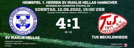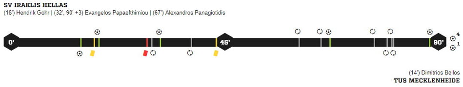 Dimitrios Bellos brachte sein Team in der 14. Minute nach vorn. Hendrik Göhr sicherte SV Iraklis Hellas nach 18 Minuten den Ausgleich durch einen Elfmeter. Nach nur 30 Minuten verließ Marios Sachpeloglou von TUS Mecklenheide das Feld, Lambros Liaskos kam in die Partie. Durch einen Elfmeter von Evangelos Papaefthimiou gelang SV Iraklis Hellas das Führungstor. Die Elf von Coach Patrick Lang führte zur Halbzeit knapp mit einem Tor Vorsprung. Alexandros Panagiotidis erhöhte den Vorsprung des Heimteams nach 67 Minuten auf 3:1. In der Nachspielzeit besserte Papaefthimiou seine Torbilanz nochmals auf, als er in der 93. Minute seinen zweiten Tagestreffer für SV Iraklis Hellas erzielte. Schließlich sprang für SV Iraklis Hellas gegen den TUS Mecklenheide ein Dreier heraus.