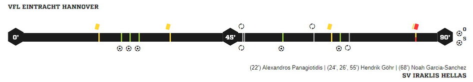 Alexandros Panagiotidis brachte den Spitzenreiter in der 22. Minute in Front. Mit einem schnellen Doppelpack (24./26.) zum 3:0 schockte Hendrik Göhr den VfL Eintracht Hannover. SV Iraklis Hellas dominierte den Gegner zur Pause nach Belieben und ging mit einer deutlichen Führung in die Kabine. Der Gast konnte mit dem ersten Durchgang sehr zufrieden sein. Trotzdem gab es Veränderungen bei Team von Patrick Lang. Konstantinos Herheletzis ersetzte Konstantinos Papakonstantinou, der nun schon vorzeitig Feierabend machte. Zum Seitenwechsel ersetzte Tobias Bombach von VfL Eintracht Hannover seinen Teamkameraden Manuel Franke. Mit dem 4:0 von Göhr für SV Iraklis Hellas war das Spiel eigentlich schon entschieden (55.). Eigentlich war der VfL Eintracht Hannover schon geschlagen, als Noah Garcia-Sanchez das Leder zum 0:5 über die Linie beförderte (68.). Mit dem Schlusspfiff durch Referee Murat Kilinc fuhr SV Iraklis Hellas einen Kantersieg ein, der sich schon vor der Halbzeitpause abgezeichnet hatte.