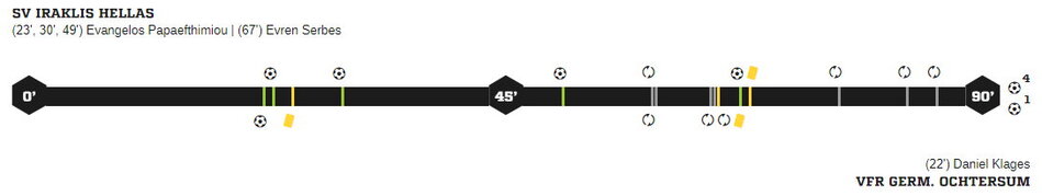Daniel Klages brachte sein Team in der 22. Minute nach vorn. Evangelos Papaefthimiou schockte den VfR Germ. Ochtersum und drehte die Partie mit seinem Doppelpack für SV Iraklis Hellas (23./30.). SV Iraklis Hellas hatte zur Pause eine knappe Führung auf dem Zettel stehen. Mit dem Tor zum 3:1 steuerte Papaefthimiou bereits seinen dritten Treffer an diesem Tag bei (49.). In der 64. Minute stellte der VfR Germ. Ochtersum personell um: Per Doppelwechsel kamen Leonard Wöckener und Philipp Timkov auf den Platz und ersetzten Maximilian-Alexander Schulze und Fynn Müller. Evren Serbes legte in der 67. Minute zum 4:1 für SV Iraklis Hellas nach. Mit dem Schlusspfiff durch den Unparteiischen Sina Kühn siegte das Team von Patrick Lang gegen den VfR Germ. Ochtersum.