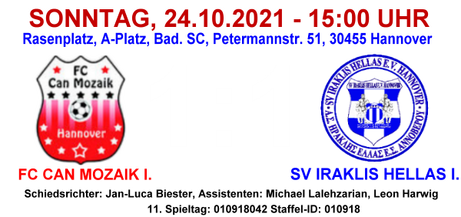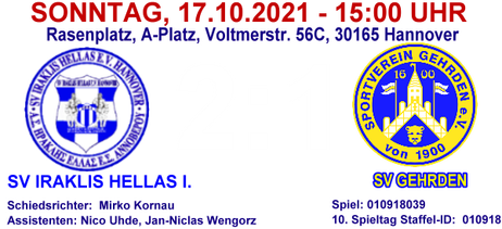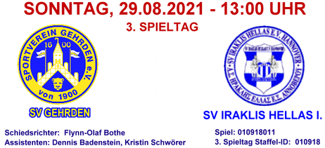 Am kommenden Sonntag trifft der SV Iraklis Hellas auf den FC Can Mozaik, der SV Gehrden spielt am selben Tag gegen den SV Ihme-Roloven.