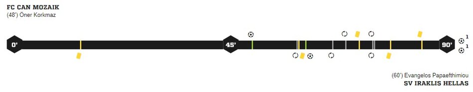 Treffer bekamen die Zuschauer in Durchgang eins nicht zu sehen. Torlos ging es in die Halbzeit. Öner Korkmaz brachte den Ball zum 1:0 zugunsten des FC Can Mozaik über die Linie (48.). Das 1:1 des SV stellte Evangelos Papaefthimiou sicher (60.). Letzten Endes wurde in der Begegnung des FC Can Mozaik mit dem SV Iraklis Hellas kein Sieger gefunden.