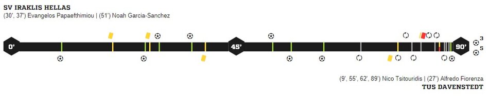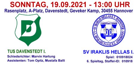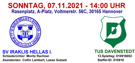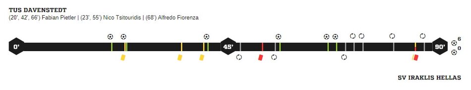Fabian Pietler brachte den TuS in der 20. Minute nach vorn. Nico Tsitouridis beförderte das Leder zum 2:0 des Tabellenführers über die Linie (23.). Der Halbzeitpfiff war noch nicht ertönt, als Pietler seinen zweiten Treffer nachlegte (42.). Der TuS Davenstedt hatte die Chancen genutzt und blickte zur Pause auf einen deutlichen Vorsprung. Patrick Lang von SV Iraklis Hellas nahm zum Wiederanpfiff einen Wechsel vor: Marios Sachpeloglou blieb in der Kabine, für ihn kam Julen Garcia-Sanchez. Das 4:0 für den TuS stellte Tsitouridis sicher. In der 55. Minute traf er zum zweiten Mal während der Partie. Pietler zeichnete mit seinem Treffer aus der 66. Minute dafür verantwortlich, dass keine Zweifel mehr am Sieg der Mannschaft von Christian Pöppler aufkamen. In der 68. Minute legte Alfredo Fiorenza zum 6:0 zugunsten der Heimmannschaft nach. Schließlich erlitt der SV im direkten Aufeinandertreffen mit dem Abstiegskonkurrenten eine deutliche Niederlage.