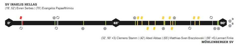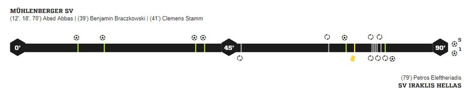 Abed Abbas glänzte an diesem Tag besonders. Er traf im Doppelpack für die Heimmannschaft (12./18.). Mit dem 3:0 von Benjamin Braczkowski für die Mannschaft von Michael Cichon war das Spiel eigentlich schon entschieden (39.). Ehe der Unparteiische die Protagonisten zur Pause bat, traf Clemens Stamm zum 4:0 zugunsten des Mühlenberger SV (41.). Der dominante Vortrag des Mühlenberger SV im ersten Spielabschnitt zeigte sich an der deutlichen Halbzeitführung. Patrick Lang schickte Angelos Gegas aufs Feld. Konstantinos Papakonstantinou blieb in der Kabine. Abbas zeichnete mit seinem Treffer aus der 70. Minute dafür verantwortlich, dass keine Zweifel mehr am Sieg des Mühlenberger SV aufkamen. Der SV stellte in der 76. Minute mit einem Dreifachwechsel groß um und schickte Nirojan Navaneethan, Marios Sachpeloglou und Petros Eleftheriadis für Umut Yildirim, Evren Serbes und Julen Garcia-Sanchez auf den Platz. In der Schlussphase gelang Eleftheriadis noch der Ehrentreffer für den Gast (79.). Schlussendlich verbuchte der Mühlenberger SV gegen den SV Iraklis Hellas einen überzeugenden Heimerfolg.