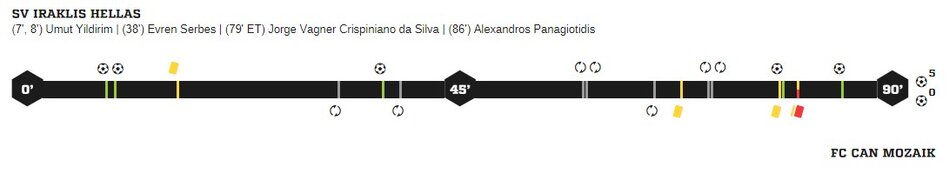 Kurz nach Spielbeginn schockte Umut Yildirim den FC Can Mozaik und traf für den SV Iraklis Hellas im Doppelpack (7./8.). Eine Niederlage war nicht nach dem Geschmack von Merter Tüfekci, der noch im ersten Durchgang Mohammed Mobascher für Hussein Mobascher brachte (33.). In der 38. Minute legte Evren Serbes zum 3:0 zugunsten des SV nach. Bis zur Halbzeit änderte sich am Stand nichts mehr und so ging es nach dem Pausenpfiff in den Kabinentrakt. In der 57. Minute stellte der SV Iraklis Hellas personell um: Per Doppelwechsel kamen Hendrik Göhr und Nirojan Navaneethan auf den Platz und ersetzten Konstantinos Herheletzis und Marios Sachpeloglou. Durch ein Eigentor von Jorge Vagner Crispiniano da Silva verbesserten die Gastgeber den Spielstand auf 4:0 für sich (79.). Alexandros Panagiotidis stellte schließlich in der 86. Minute den 5:0-Sieg für die Elf von Patrick Lang sicher. Mit dem Spielende fuhr der SV Iraklis Hellas einen Kantersieg ein. Bereits vor dem Seitenwechsel war für den FC Can Mozaik klar, dass gegen den SV heute kein Kraut gewachsen war.