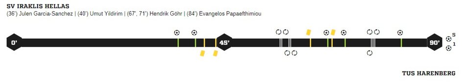 Kaum war das Spiel angepfiffen, lag der TuS bereits in Front. Pascal Biank markierte in der vierten Minute die Führung. Geschockt zeigte sich der SV Iraklis Hellas nicht. Nur wenig später war Angelos Gegas mit dem Ausgleich zur Stelle (7.). Für das zweite Tor der Gäste war Evren Serbes verantwortlich, der in der elften Minute das 2:1 besorgte. Biank beförderte das Leder zum 2:2 des TuS Harenberg in die Maschen (28.). Als manch einer bereits mit den Gedanken in der Halbzeitpause war, besorgte Umut Yildirim auf Seiten des SV das 3:2 (41.). Der SV Iraklis Hellas nahm die knappe Führung mit in die Kabine. Der SV baute die Führung im weiteren Verlauf aus. Gegas (56.), Alexandros Panagiotidis (59.) und Serbes (63.) trafen ins Schwarze und sorgten damit für klare Verhältnisse. Der bisherige Spielverlauf lief nach dem Geschmack von Patrick Lang, sodass die Situation es hergab, einen Doppelwechsel vorzunehmen: Petros Eleftheriadis und Antonios Vintzilaios kamen für Hendrik Göhr und Serbes ins Spiel (66.). Pascal Biank wollte den TuS zu einem Ruck bewegen und so sollten Ylber Sulejmanoski und Maurice-Vincent Gienow eingewechselt für Kai-Michael Scheffel und Carlos Sanchez-Pazos neue Impulse setzen (71.). Mit Biank und Jan-Erik Neumann nahm Pascal Biank in der 80. Minute gleich zwei Spieler aus der Startformation vom Feld. Ersetzt wurden sie von Lutz Petrat und Christoph Growe. Am Ende kassierte der TuS Harenberg im Kellerduell mit dem SV Iraklis Hellas eine klare Niederlage.