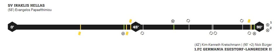 Wenige Momente vor dem Seitenwechsel war Kim-Kenneth Kretschmann mit dem 1:0 für die Gäste zur Stelle (42.). Einen Torerfolg in Halbzeit eins verbuchte lediglich 1.FC Germania Egestorf-Langreder II, womit man eine knappe Führung mit in die Kabinen nahm. Bei 1.FC Germania Egestorf-Langreder II kam zu Beginn der zweiten Hälfte Nick Bürger für Tom Renken in die Partie. Evangelos Papaefthimiou ließ sich in der 58. Minute nicht zweimal bitten und verwertete zum 1:1 für den SV. Mit einem Doppelwechsel holte Arndt Westphal Bastian Gandyra und Kretschmann vom Feld und brachte Christoph Jülke und Maik Renken ins Spiel (73.). Das Unentschieden zeichnete sich mehr und mehr ab, doch dann schlug Bürger in der Nachspielzeit zu und erzielte den Führungstreffer für 1.FC Germania Egestorf-Langreder II. Am Ende nahm 1.FC Germania Egestorf-Langreder II bei SV Iraklis Hellas einen Auswärtssieg mit.