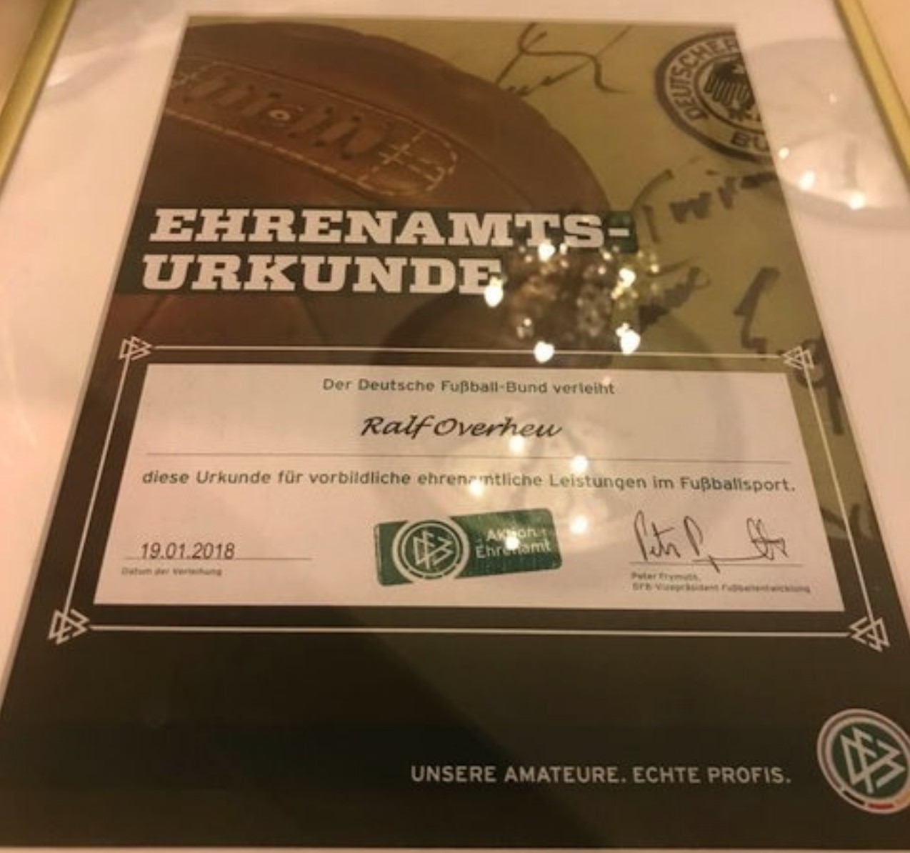 Am 19.01.2018 wurde unser Vereinsmitglied, Ralf Overheu, mit der Ehrenamtsurkunde des Deutschen Fußball- Bundes für seine vorbildliche ehrenamtliche Leistung im Fußballsport ausgezeichnet.
