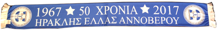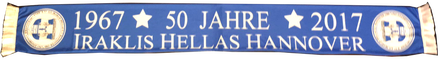Verehrte Sportsfreunde, wir sind sehr erfreut, Ihnen unseren Jubiläumsschal präsentieren zu können. Bestellungen können an sh@oh5.de aufgegeben werden. Ein Schal kostet 15,00 € plus Versandkosten. Αξιότιμοι Συμπατριωτες Tα Επετειακά Κασκόλ της ομάδας μας "50 ΧΡΟΝΙΑ ΗΡΑΚΛΗΣ ΕΛΛΑΣ ΑΝΝΟΒΕΡΟΥ" είναι διαθέσιμα και μπορούν να παραγγελθούν, Τιμή 15,00 € το ένα, στηλτε ενα Email ή επικοινωνήστε με τον αντιπρόεδρο του Αθλητικού Σωματείου κ. Χερχελετζη αλλά και μέσω του σαιτ μας. "Μισός αιώνας και συνεχίζουμε να κρατάμε την γαλανόλευκη ψηλά" | ||