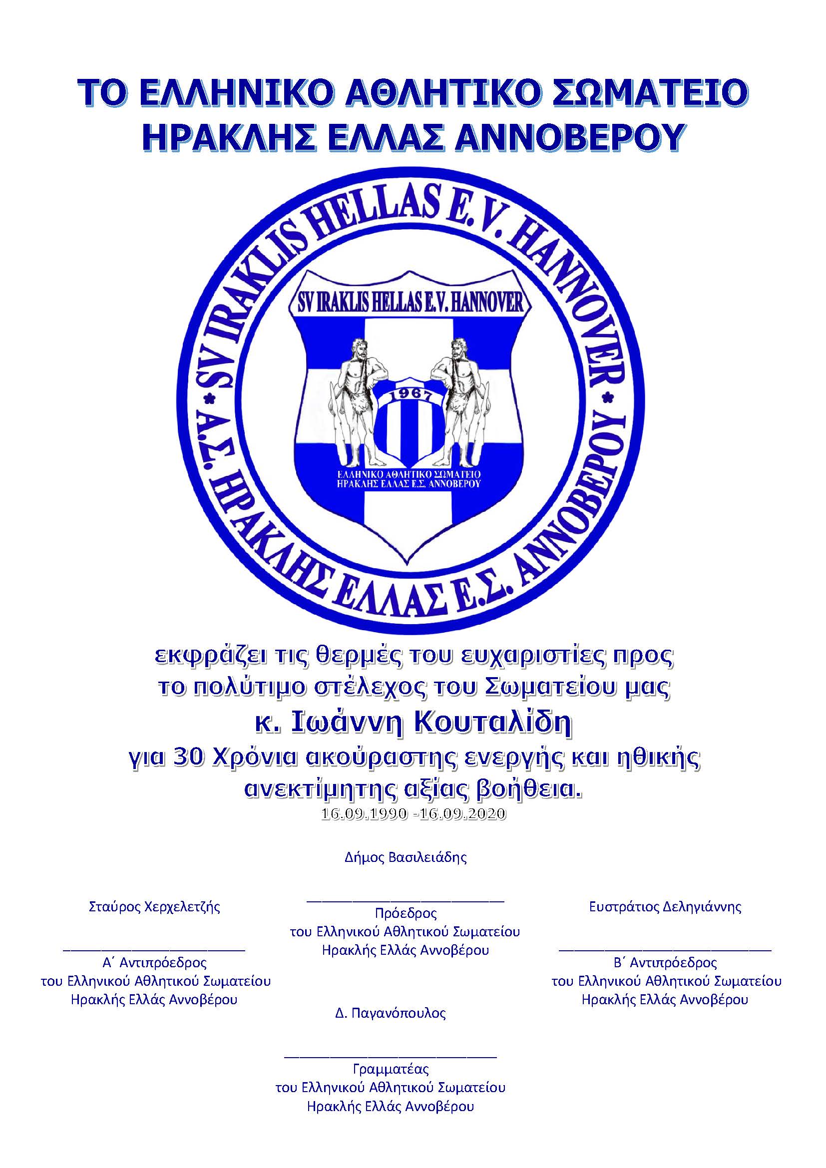 Το Ελληνικό Αθλητικό Σωματείο Ηρακλής Ελλάς Αννοβέρου εκφράζει τις θερμές του ευχαριστίες στα Μέλη και στους φιλάθλους του, για την αμέριστη συμπαράσταση και την υποστήριξη. Ας ελπίσουμε ότι η χρονιά που πέρασε να είναι η μοναδική για την δοκιμασία που περνά σήμερα η ανθρωπότητα και να απαλλαγούμε από την πανδημία, και το ξεκινημα της Νέας Χρονιάς να ειναι αφετηρία μίας δημιουργικής εποχής. Σε εσάς και την οικογένειά σας ευχόμαστε Χρόνια Πολλά και με υγεία ευτυχισμένο το 2021.