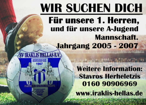 lädt alle junge Leute der Jahrgänge 2005 bis 2007 um unsere Jugendmannschaft für die kommende Spielsaison ab sofort zu verstärken. Für weitere Informationen wenden Sie sich bitte an Herrn Stavros Hercheletzis unter der Telefonnummer: 0160 90906969