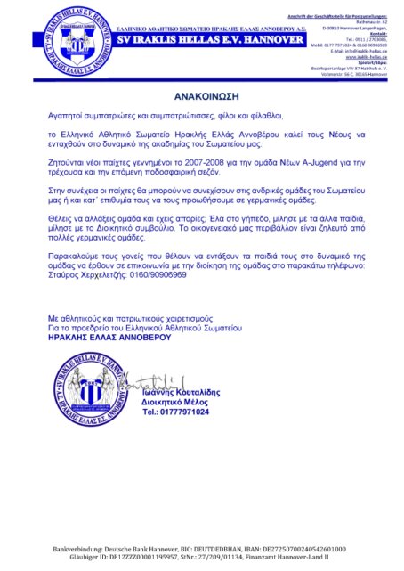 lädt alle junge Leute der Jahrgänge 2006 bis 2008 um unsere Jugendmannschaft für die kommende Spielsaison ab sofort zu verstärken. Für weitere Informationen wenden Sie sich bitte an Herrn Stavros Herheletzis unter der Telefonnummer: 0160 90906969